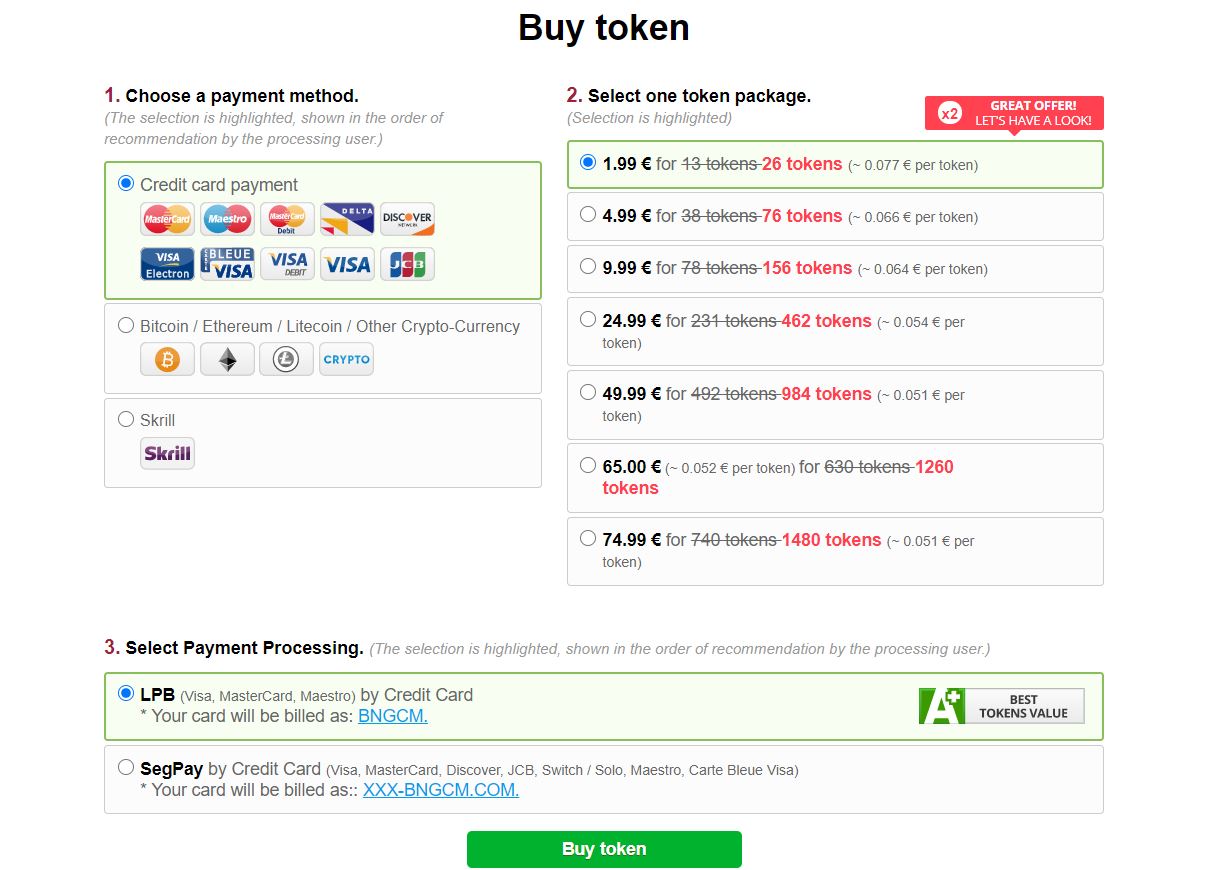 In the case of bongacams, you will pay in advance for these tokens or credits. There are 5 package options so the initial cost to try the site is very low. Your only risk to using the site is of course that initial package.